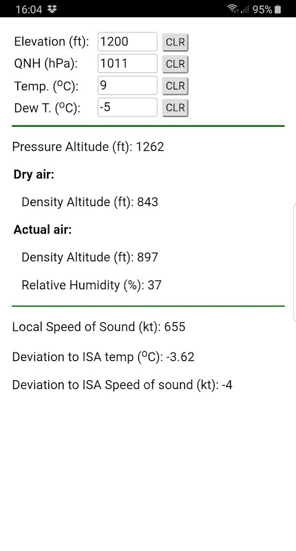 Calculates the pressure altitude and the density altitude for the dry air and also for the actual air mass accounting for the relative humidity. The calculations are presented when the user inputs the elevation, the QNH, the air temperature and the dew point temperature.