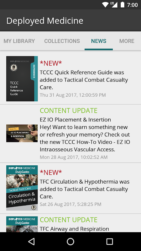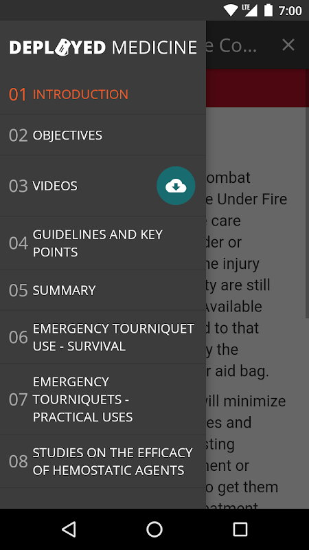 The medical content currently focuses on tactical combat casualty care (TCCC) training for combat medical personnel, and includes topics, such as hemorrhage control, airway management, hypothermia, pain control and care of wounds and splinting etc. TCCC focuses of providing the information you need to know to assess, treat and stabilize a patient at the point of injury.