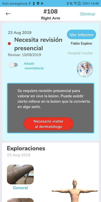 Dermo Checker te permite llevar el control de tus lesiones así como, compartirlo con un Dermatólogo que valorará la lesión en el menor tiempo posible. Las consulta son confidenciales y totalmente seguras.