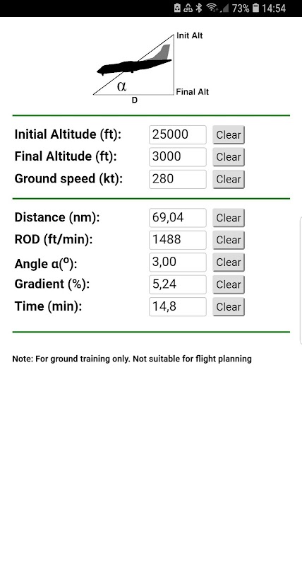 Determines the descent profile of an aircraft: for a given descent height calculates angle and gradient of descent, distance and rate-of-descent. The descent height is defined by an initial altitude (Top-of-descent - TOD) and a final altitude.