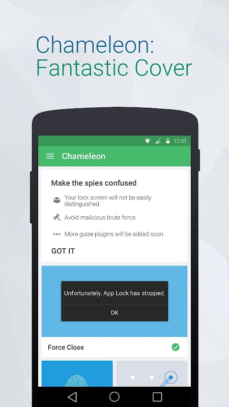 ► Chameleon: Disguise your lock screen to prevent from breaking into your password. Fingerprint scanner and fake force close dialog are now supported, and more covers are coming soon.