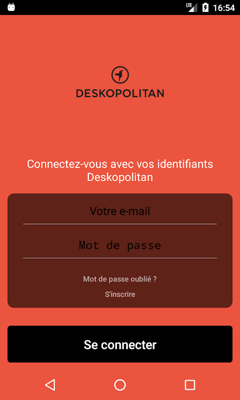 Pour vous connecter à l’application vous devez utiliser les identifiants habituels à votre espace de réservation web https://deskopolitan.cowork.io