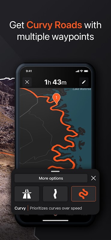 - Curvy Routes: Select curvy routes or autogenerate a round trip for an exciting and thrilling ride with plenty of twists and curves.