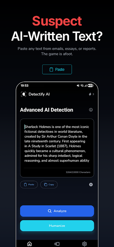 Unmask AI-generated text. Detect & humanize content with Sherlock's precision