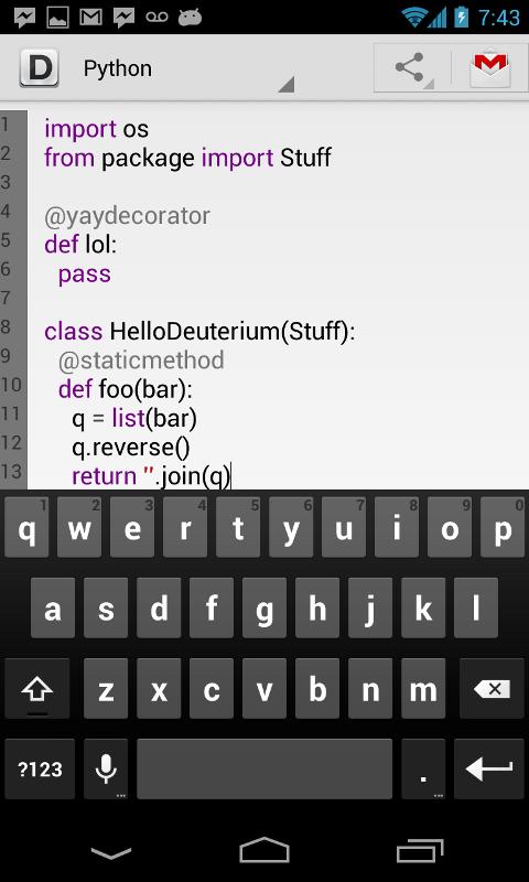 Minimal implementation of a syntax highlighting code editor for Android. Developed as the basis of version 2.0 of DeuterIDE, available on Google Play: https://play.google.com/store/apps/details?id=com.didactic.DeuterIDE