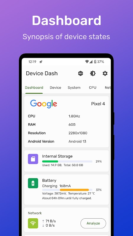 Device dash is an efficient tool that displays a wide variety hardware and software parameters and information for you. It uses the Material You design languageļ¼ and the theme color changes with wallpaper on Android 12 and later.