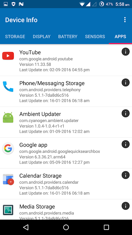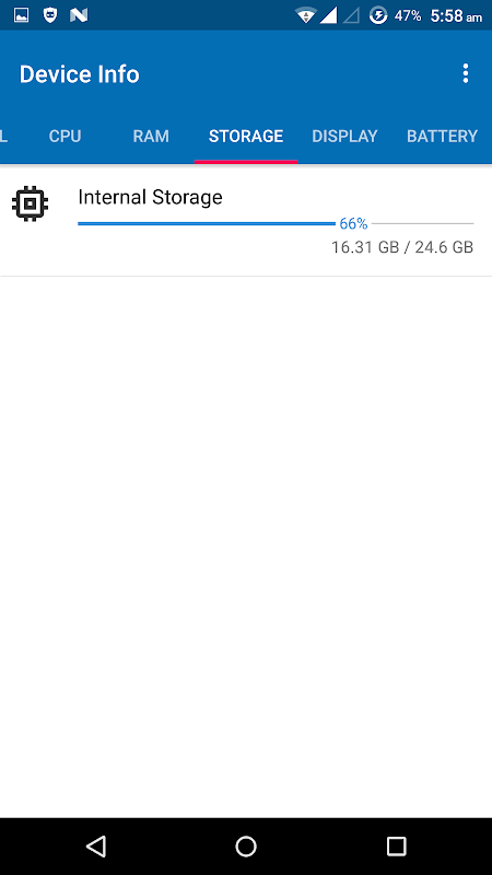 ● Storage information (Information about Internal Storage, SD Card, etc).