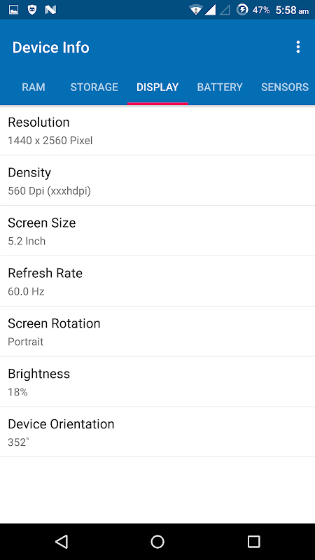 ● Display information (Resolution, Density, Screen Size, Orientation, Refresh Rate, etc).