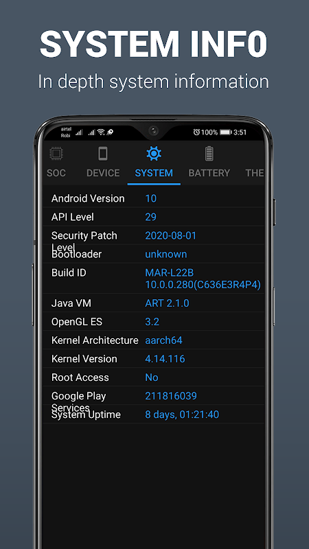 * Find detailed system info such as API level, system uptime, security patch level, etc