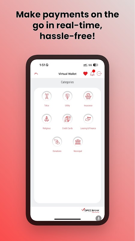 It offers users a hassle free and convenient option to manage their funds, eliminating the need to carry any other payment instrument. Users can maintain funds in the Virtual Wallet and conduct day-to-day transactions at the click of a button such as; Add transfers between own accounts , pay at selected merchants , send money / gift cards to anyone in Sri Lanka and payment of utility bills. In addition to its superior features the DFCC Virtual Wallet also facilitates a far greater level of interaction with the bank payment and fund transfer systems that enables users to experience convenience through digital banking services throughout Sri Lanka.