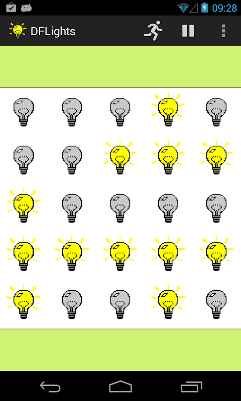The game "lights" consists of a 5 by 5 grid of lights; when the game starts, all lights are switched off. Pressing one of the lights will toggle it and the four lights adjacent to it on and off. (Diagonal neighbours are not affected.) The game provides a puzzle: to switch all the lights on.