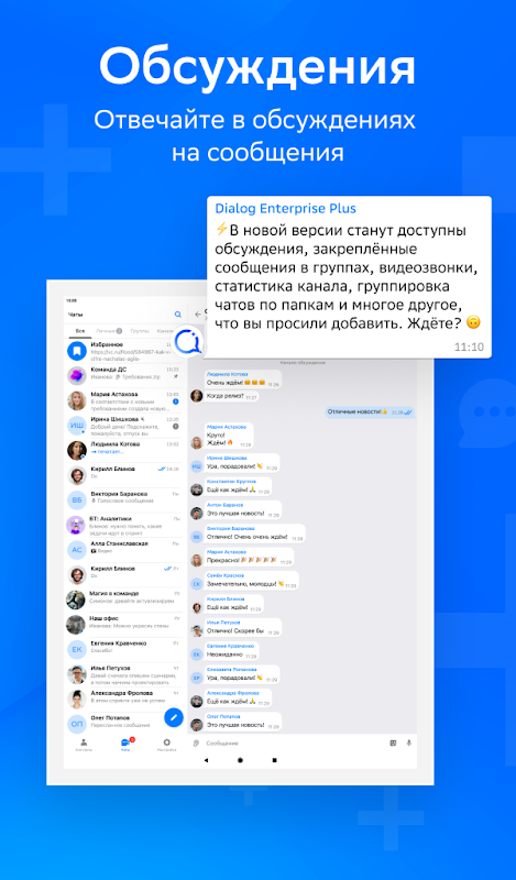 - Решайте задачи и достигайте целей быстрее с коллегами в личных и групповых чатах;