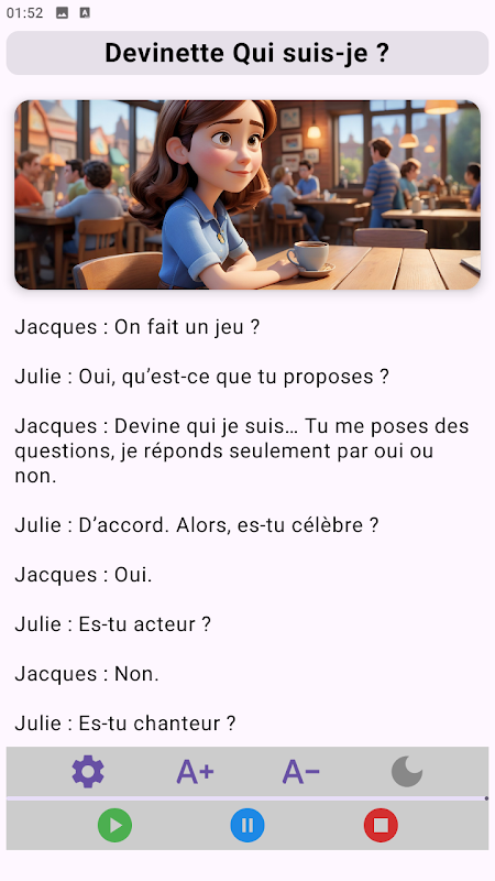Improve your French (level A1) with short, natural, and readable dialogues, accompanied by clear audio. Ideal for beginners, reviewing basic grammar, and improving your listening comprehension... even offline.