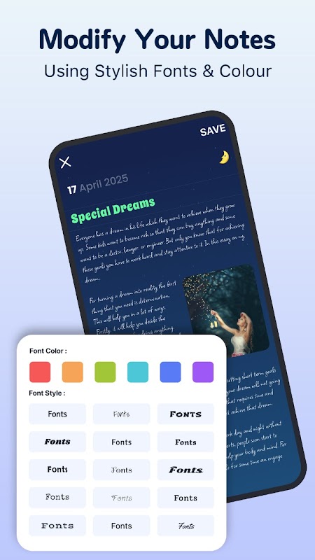 Daily diary journal allows you to make daily notes with colorful backgrounds, pictures, videos, stylish fonts, customizable themes, etc.