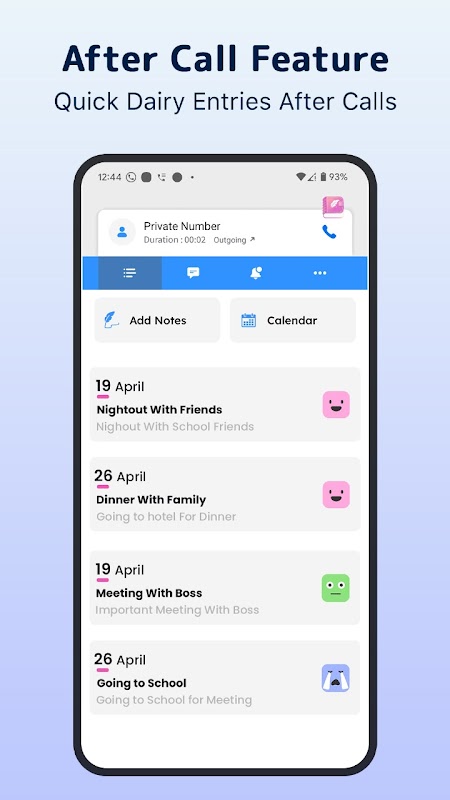 This remarkable diary app comes packed with features to help you document your daily life effortlessly. One standout is the aftercall feature, which lets you instantly jot down a diary entry right after every phone call. Whether you're capturing the essence of a conversation, recording key moments, or simply reflecting on your day, this app makes it easy to keep your thoughts organized and ensures that no detail slips away after each call.