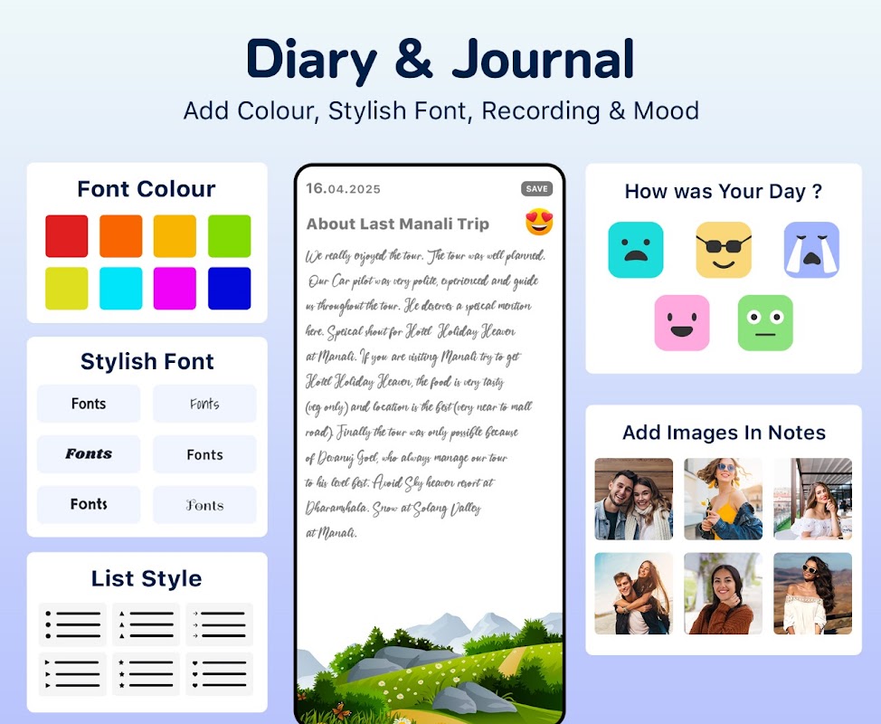 My Diary app is more than just a journaling app; a free journal app is your personal space to write notes, plan, and grow. Whether you’re capturing daily moments, tracking personal growth, or simply capturing your thoughts, our app provides a secure and enriching experience.
