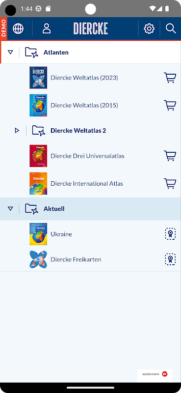 The free app includes four maps from the current Diercke World Atlas, the Diercke 2 World Atlases and the Diercke Three Universal Atlas as well as three maps from the Diercke International Atlas for free and permanent use. The complete Atlas content can be activated as an annual license by purchasing a license on the website www.diercke.de/digital or in-app purchase (in preparation).