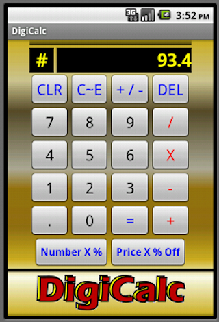 This is a simple calculator that allows you to ADD, SUBTRACT, MULTIPLY, and DIVIDE. It does do decimals as well. You can DELETE a digit entered by mistake. You can CLEAR an ERROR line, or you may simply CLEAR the DISPLAY and start over. This calculator has an additional shopping percentage Off button. Which returns a two decimal price. For example if something is regularly priced at 39.99 you enter that in the calculator then hit the X (times) function button; then enter the percentage off as a number - e.g. 15 (for 15%); you then press the "Price X % Off" button and it will return the amount you will actually pay! In this case 33.99, my wife thinks it is slick when she goes shopping and has a discount card or coupon (It was her idea).