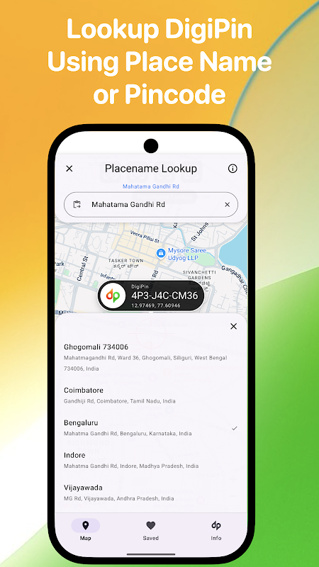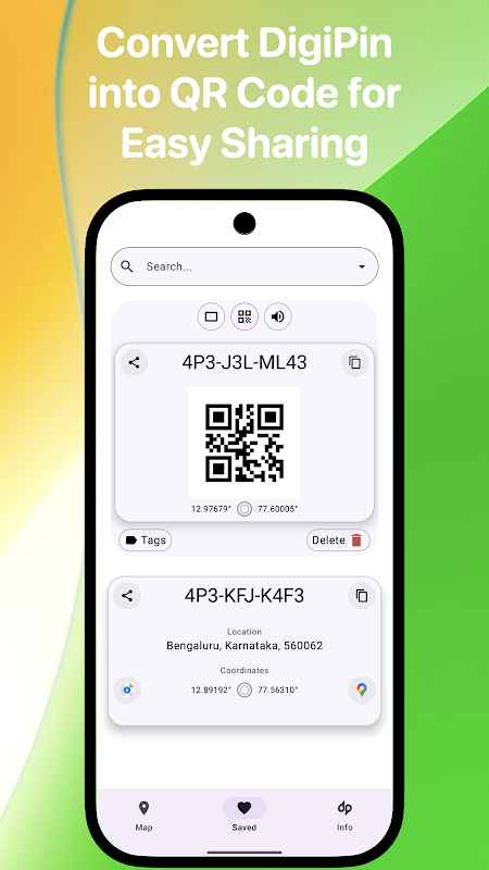 Save your favorite DigiPins as cards. Add tags like “home” or “office” and search them later using partial DigiPins or address terms.