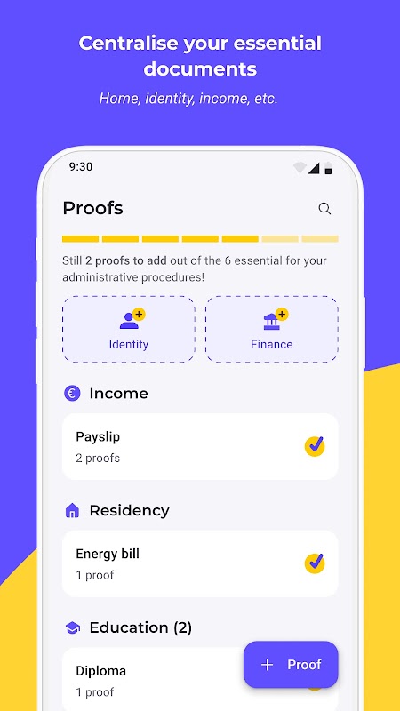 All the documents useful for your procedures are accessible via the "Supporting documents" section. Find all your proofs of identity, address, income, education, professional and banking documents.