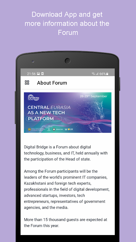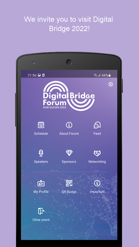 DigitalBridge is a mobile application developed specifically for the international forum on digital technologies, business and IT, which will be held on September 28 and 29, 2022 at the Expo IEC, Nursultan, Republic of Kazakhstan.