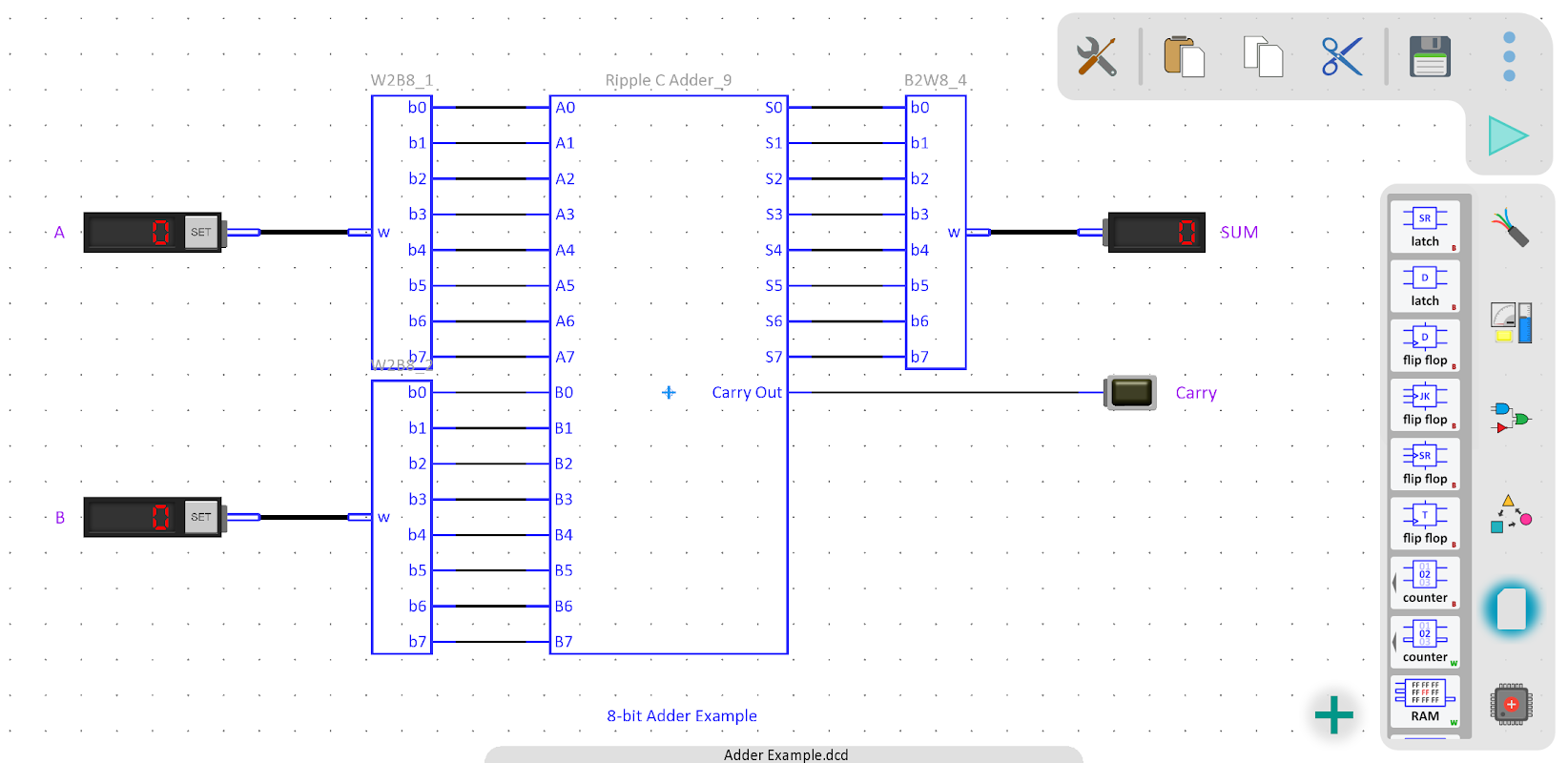 Digital Circuit Simulator helps in the creation of basic to complex digital circuits by using different components like logic gates, counters, decoders, Flip-flops, and much more.