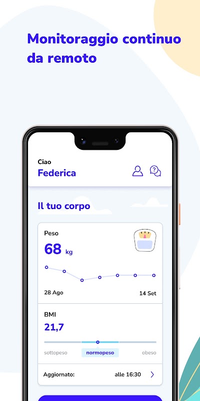 Innovative Clinical Governance Wellness App connected to a Telemedicine platform. The App allows you to monitor your own well-being parameters and achieve goals agreed with a coach on televisit. The App requires the user to enter some manual data and record other parameters automatically using some fitness devices. The App allows you to carry out televisits with coaches or nutrition professionals aimed at improving well-being, to upload, exchange some documents and diagnostic tests and exchange them with an operations centre. The App focuses on 5 fundamental parameters for monitoring well-being: