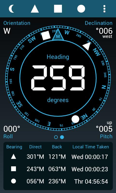 Record up to three compass bearings using the three middle buttons on the top tool bar. The bearings can be displayed around the compass and can be used to get a three point compass fix.