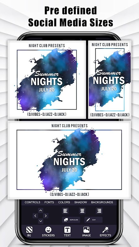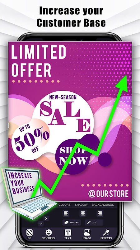 Create promotional posters, advertisement, offer announcements, cover photos on the go with amazing backgrounds, texture, effects, fonts, sticker and get the attention you want.