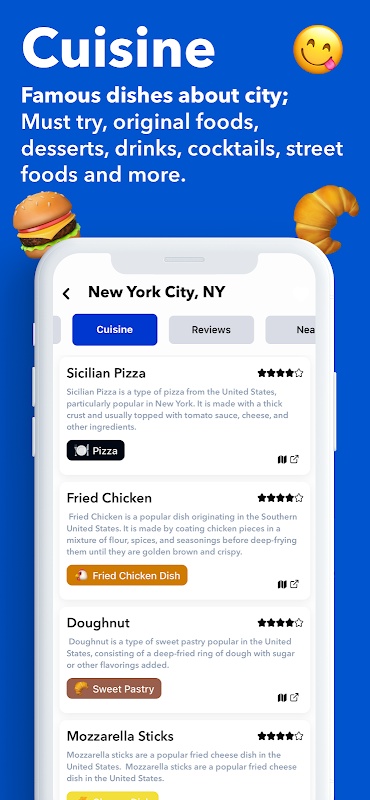 Cuisine – Learn about the best and most famous food of the city, which dishes you should try, and which cuisines are originally from there. Also find information about drinks quickly.