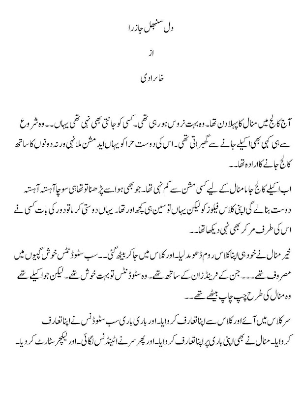 We are presenting Dil Sambhal Ja Zara by Khanzadi, an Urdu romantic and social novel. She is a renowned play writer and novelist and have some very famous novels like Hathon ki lakeeron main likha hain, Dillagi, Haweli, Duaey Mehraj, Zid.
