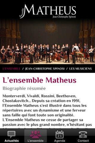 This unique app invites you to follow all the current events of the Ensemble Matheus and its conductor Jean-Christophe Spinosi with many photos, videos and articles.