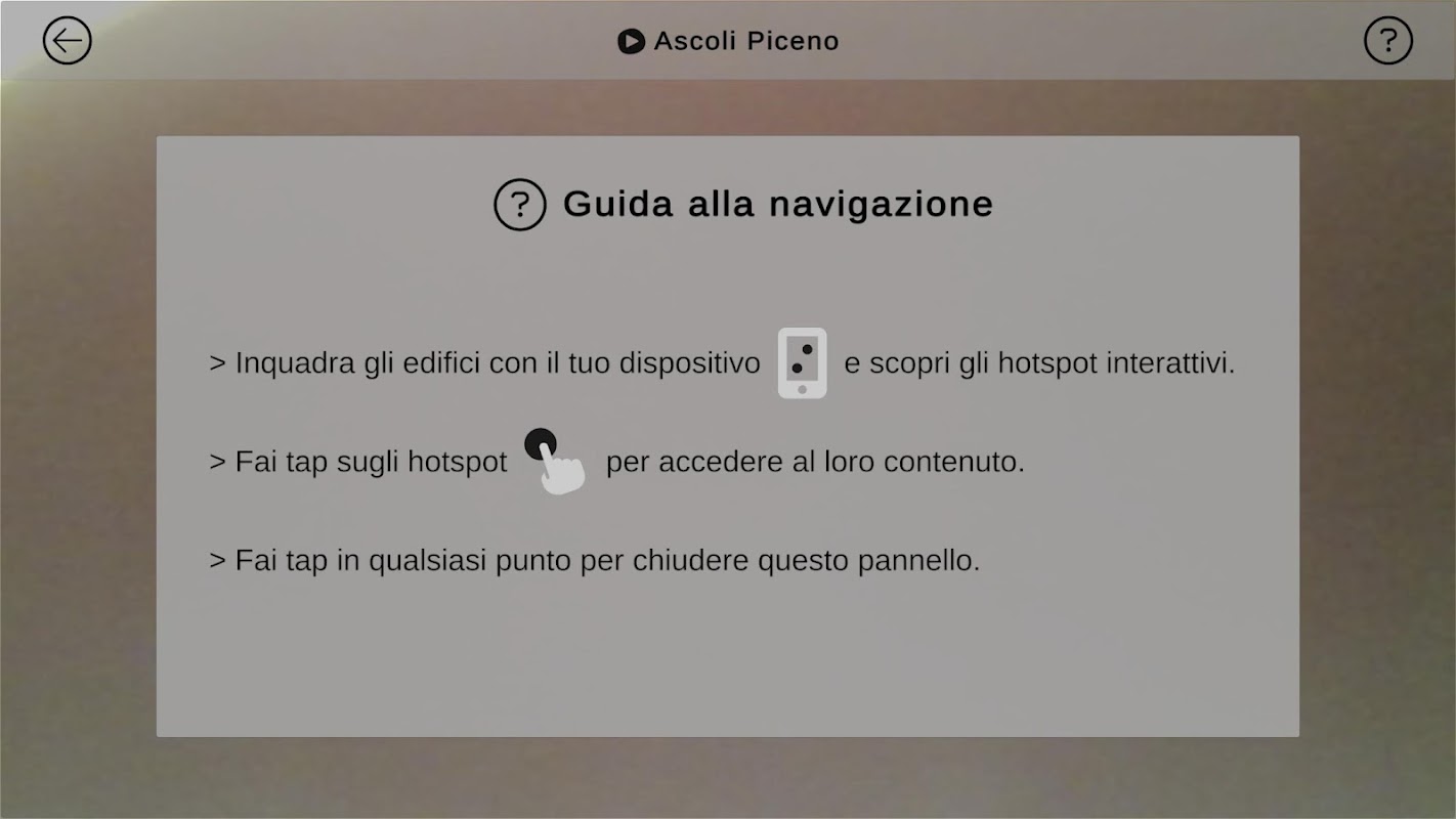 The app uses augmented reality technologies and virtual reconstruction of the environment to allow users to learn about stories and anecdotes currently anchored in the buildings of the historic centers of Ascoli Piceno, Grottammare and Offida.