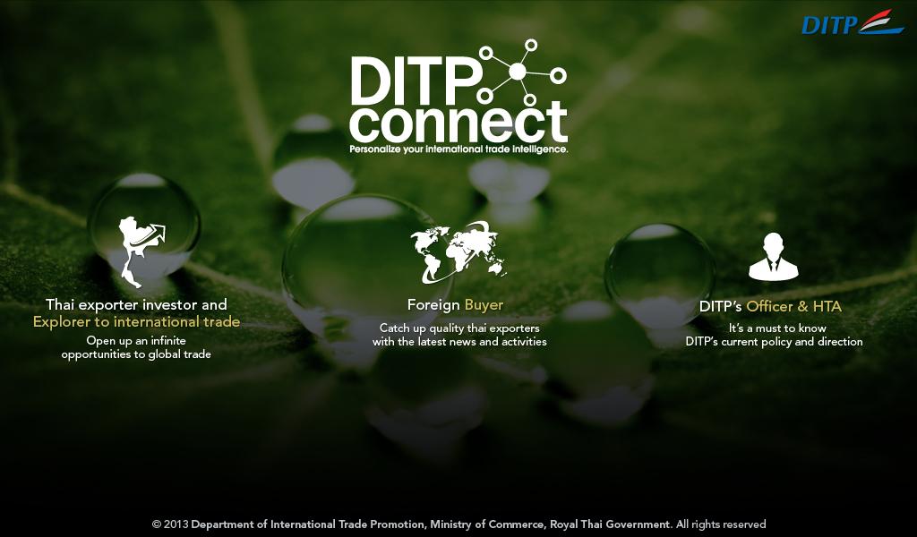 With the new Department of International Trade Promotion: DITP (Ministry of Commerce, Thailand) Mobile Application, "DITP Connect," it's the first Thai international trade application that allows "Personalized international trade information on your hand" and thus, it's hardly a surprise for anyone to miss key international trade intelligent information, trends and activities.