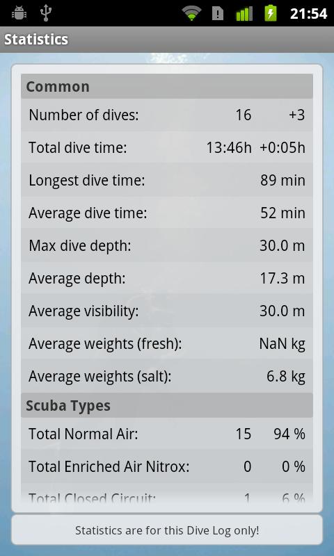 An electronic Scuba Dive Log book for Android. Record your dives and diving licenses, view sites on a map, and dive statistics. Buy the Dive Log Key to unlock the full functionality and support development. Without the Key only a small number of dives can be stored.