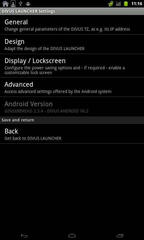 The DIVUS LAUNCHER app shows a simple grid of 6 fields that permit a quick access to the most important functions / apps. Naturally it is possible to create more than one launcher page, with the possibility to change between them using a swipe gesture. Furthermore the app offers also a series of settings which should make easier the configuration of DIVUS TOUCHZONE.