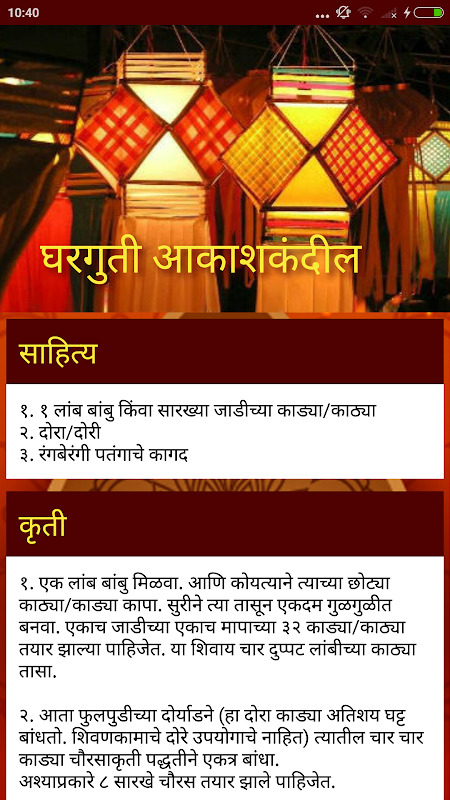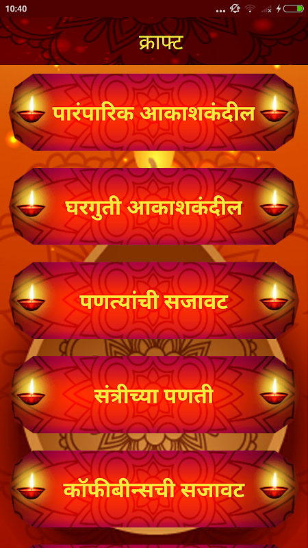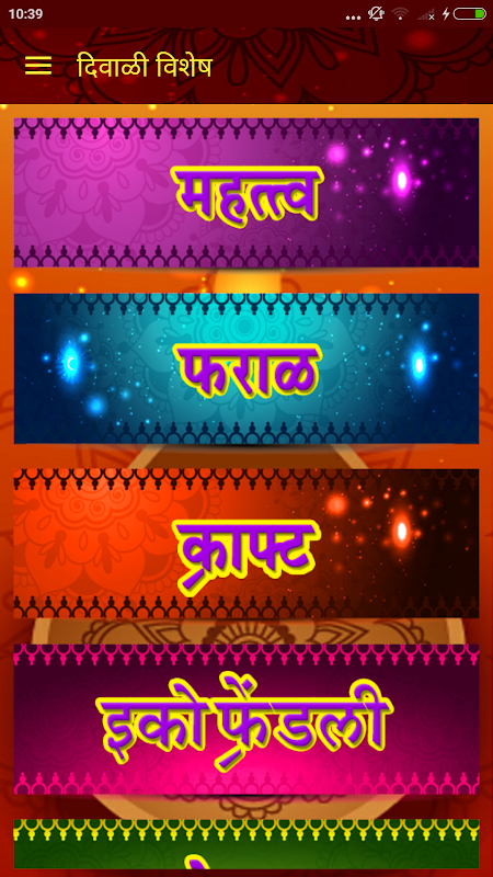 दिवाळी विशेष अँप लहान पासून ते मोठ्या पर्यंत सर्वाना उपयुक्त असा अँप आहे. या अँप मध्ये तुम्ही दिवाळीचा फराळ कसा करावा हे शिकू शकता, या अँप मध्ये वायुप्रदूषण व ध्वनिप्रदूषण मुक्त दिवाळी कशी साजरी करावयाच्या टिप्स दिले आहेत, दिवाळीच्या ५ दिवसाचे महत्व या अँप मध्ये दिले आहे,धनत्रयोदिशी लक्षात घेता या मध्ये लक्ष्मी देवीचं वॉलपेपर आणि लक्ष्मी देवीचं देवघर हि नवीन संकल्पना या मध्ये देण्यात अली आहे, या अँप च्या माध्यमातून दिवाळी मधले क्राफ्ट कसे बनवायचे या बद्दलचे टिप्स देखील या अँप मध्ये देण्यात आले आहेत