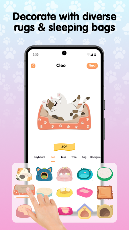 1️⃣ Start by adding your cat names, then choose from a variety of cozy rugs and sleeping bags.