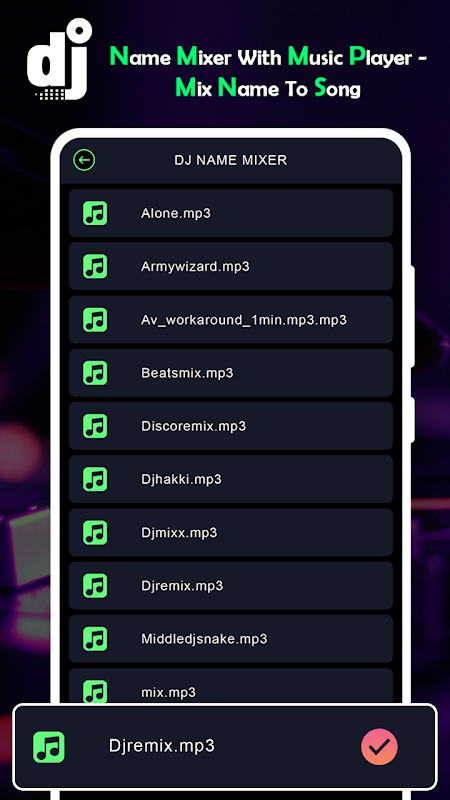 DJ Name Mixer With Music Player - Mix Name To Song It’s a very User-friendly app which allows adjusting the volume or specific voice time interval options with which your DJ song is awesome. This is a music mixer which helps you mix your name to any song.