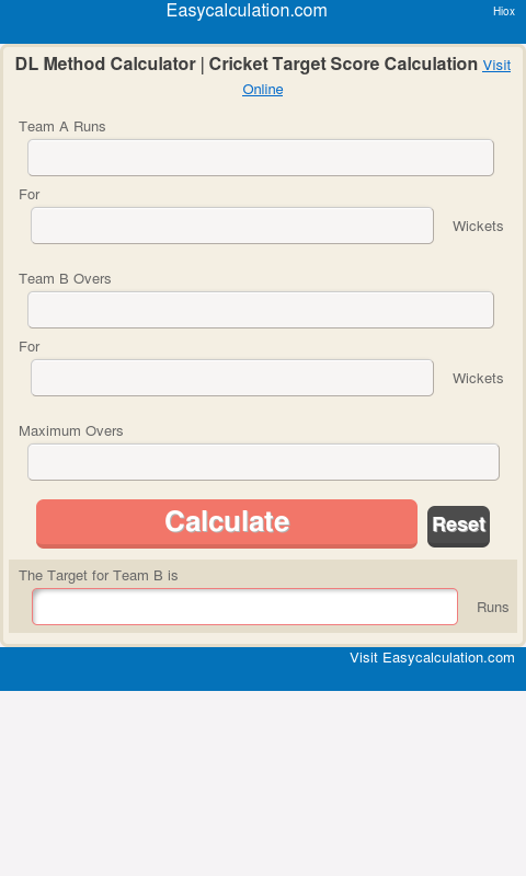 DL Method Calculator calculates target scores for rain interrupted limited overs cricket matches.