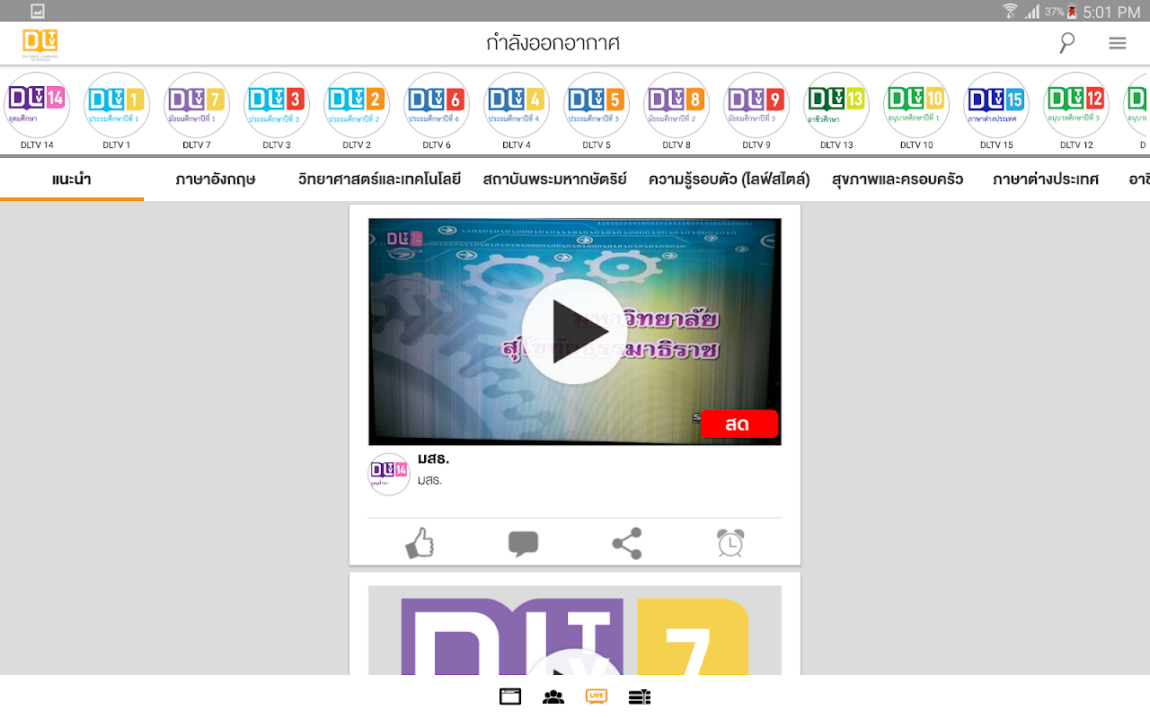 - ดูรายการสดช่องรายการแยกตามชั้นเรียน (DLTV1-15) ซึ่งสามารหยุดชั่วขณะระหว่างรับชม และกด Play เพื่อดูต่อได้