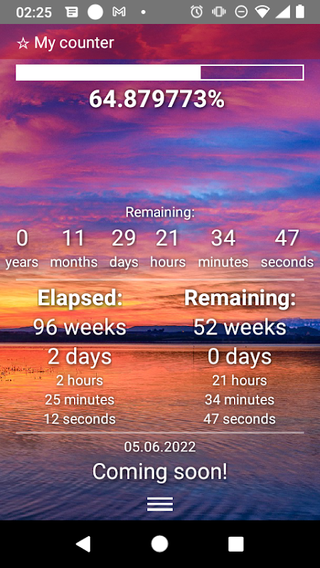DMB Counter: countdown timer days. Simple and easy counter that shows how many percent of the start date of the back and how much is left before the event in years, months, days, hours, minutes and seconds. To start the timer, you just need to specify the start date and end date.