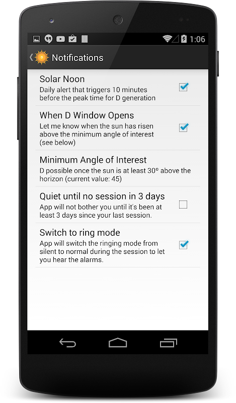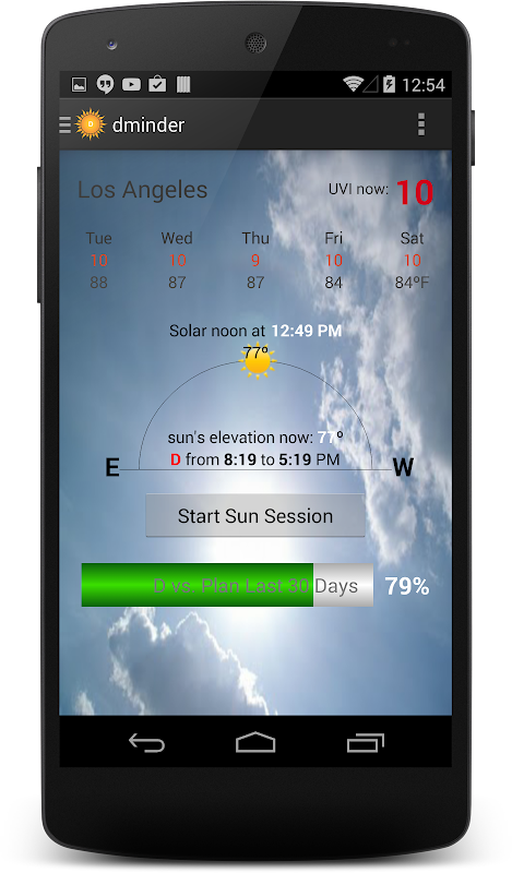 D-Minder helps you maintain optimal vitamin D levels by tracking sun exposure, supplements, and dietary intake. Using real-time solar position and satellite ozone data, D-Minder calculates how much vitamin D you produce during each session.