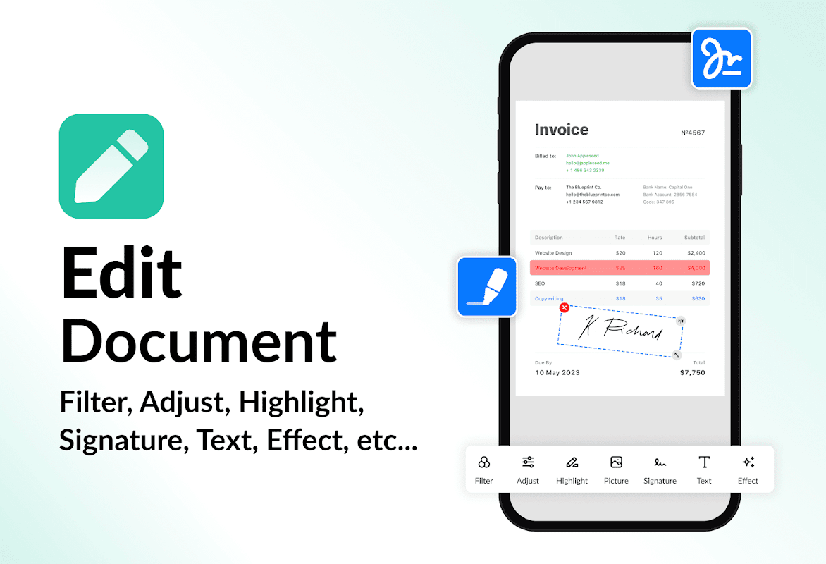 Crop, rotate, watermark, add text, adjust brightness/contrast, or apply filters to make your documents look perfect.