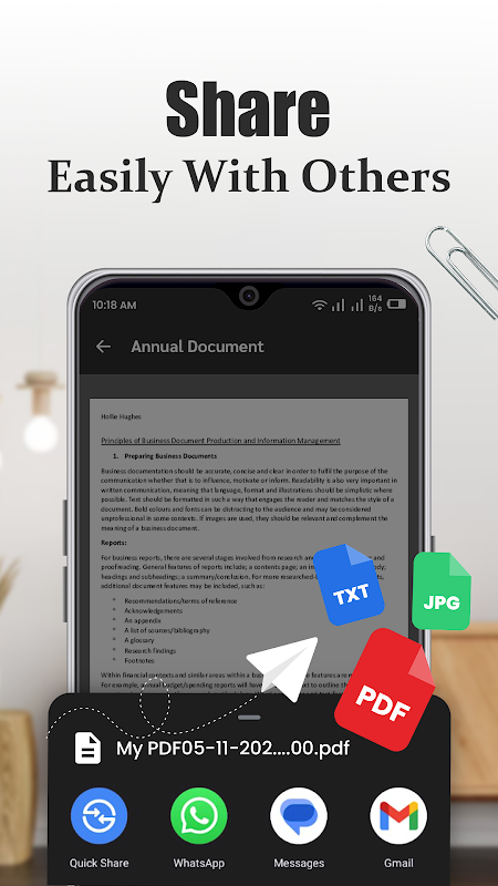 Install this PDF scanner to quickly scan, save, and share documents in PDF, JPG, or TXT format.