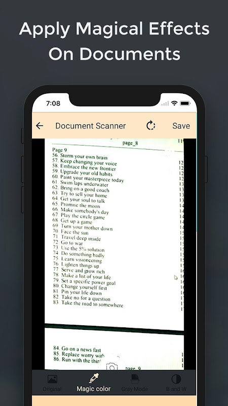 You can apply effects on documents like gamma, black & white, magical effects on documents.