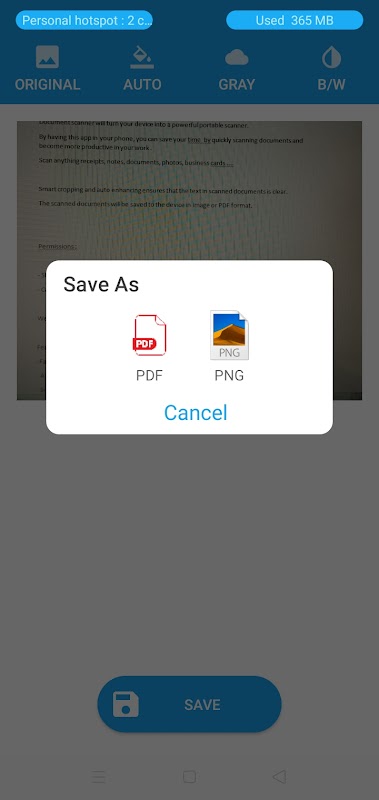 The scanned documents will be saved to the device in image or PDF format.