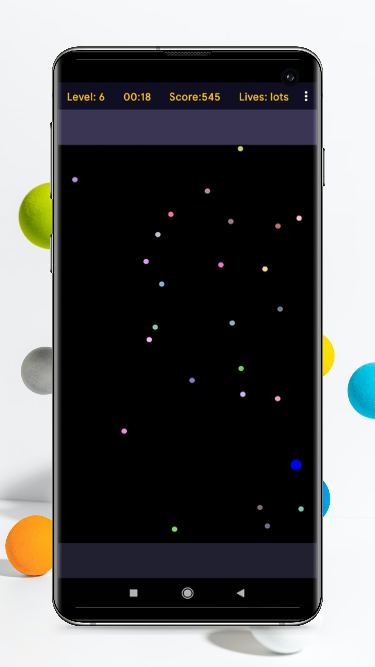 To play the game, you must guide the blue circle towards the light blue goal area while avoiding the enemy dots that move around the field. You can control the circle's movement by tilting your device, or by touching the screen. As you progress to the goal area, the level will advance, more dots will appear, and the goal will switch to the other end. In normal mode, you have 3 lives, but free play mode has unlimited lives and allows you to continue from the highest level you've reached before. The game also calculates your score according to the time for each level.