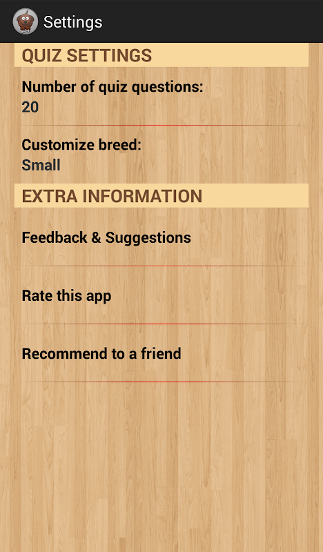 Number of quiz questions and dog breeds category can be easily changed from setting menu.