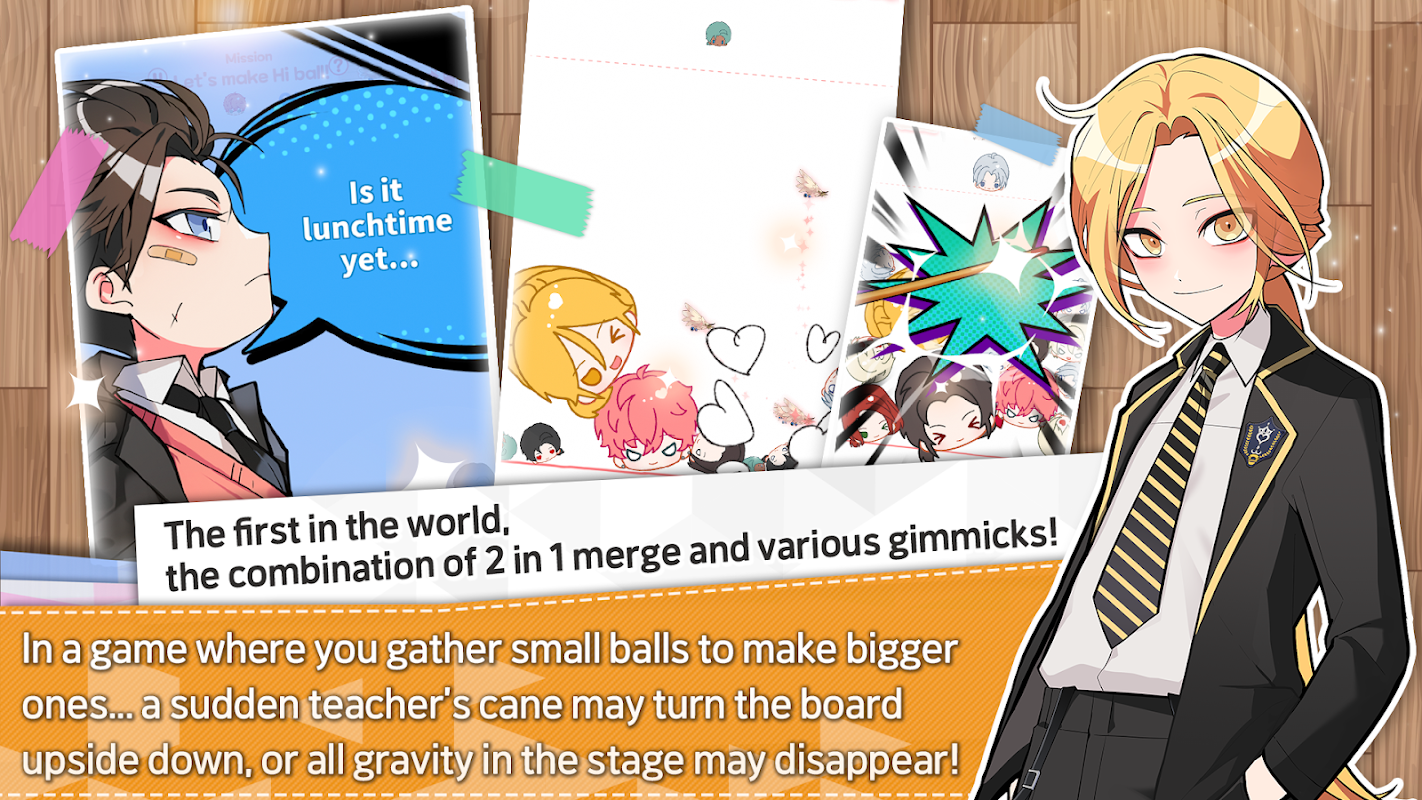 Merge two balls to make a bigger and cuter ball. As you repeat the stages full of cute faces you can collect more entertaining quests, interesting episodes, and special dolls with various stories. Make your own school campus with event stories that are updated monthly and with various decoration elements.
